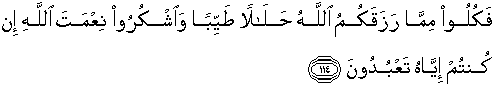 114. Maka makanlah yang halal lagi baik dari rezki yang telah diberikan Allah kepadamu; dan syukurilah nikmat Allah, jika kamu hanya kepada-Nya saja menyembah.