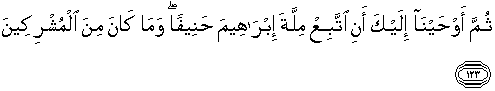 123. Kemudian Kami wahyukan kepadamu (Muhammad): "Ikutilah agama Ibrahim seorang yang hanif" dan bukanlah dia termasuk orang-orang yang mempersekutukan Tuhan.