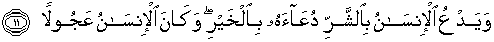 11. Dan manusia mendoa untuk kejahatan sebagaimana ia mendoa untuk kebaikan. Dan adalah manusia bersifat tergesa-gesa.