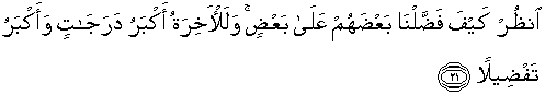 21. Perhatikanlah bagaimana Kami lebihkan sebagian dari mereka atas sebagian (yang lain). Dan pasti kehidupan akhirat lebih tinggi tingkatnya dan lebih besar keutamaannya.