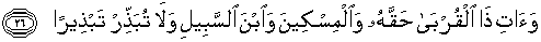 26. Dan berikanlah kepada keluarga-keluarga yang dekat akan haknya, kepada orang miskin dan orang yang dalam perjalanan dan janganlah kamu menghambur-hamburkan (hartamu) secara boros.