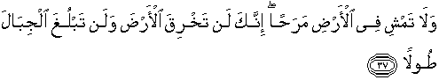 37. Dan janganlah kamu berjalan di muka bumi ini dengan sombong, karena sesungguhnya kamu sekali-kali tidak dapat menembus bumi dan sekali-kali kamu tidak akan sampai setinggi gunung.