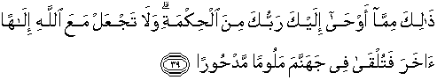 39. Itulah sebagian hikmah yang diwahyukan Tuhanmu kepadamu. Dan janganlah kamu mengadakan tuhan yang lain di samping Allah, yang menyebabkan kamu dilemparkan ke dalam neraka dalam keadaan tercela lagi dijauhkan (dari rahmat Allah).