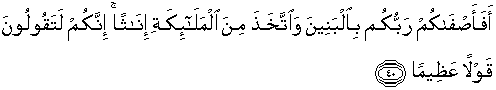 40. Maka apakah patut Tuhan memilihkan bagimu anak-anak laki-laki sedang Dia sendiri mengambil anak-anak perempuan di antara para malaikat? Sesungguhnya kamu benar-benar mengucapkan kata-kata yang besar (dosanya).