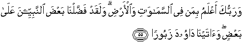 55. Dan Tuhan-mu lebih mengetahui siapa yang (ada) di langit dan di bumi. Dan sesungguhnya telah Kami lebihkan sebagian nabi-nabi itu atas sebagian (yang lain), dan Kami berikan Zabur kepada Daud.
