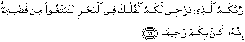 66. Tuhan-mu adalah yang melayarkan kapal-kapal di lautan untukmu, agar kamu mencari sebahagian dari karunia-Nya. Sesungguhnya Dia adalah Maha Penyayang terhadapmu.