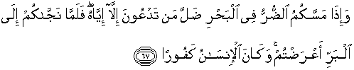 67. Dan apabila kamu ditimpa bahaya di lautan, niscaya hilanglah siapa yang kamu seru kecuali Dia, Maka tatkala Dia menyelamatkan kamu ke daratan, kamu berpaling. Dan manusia itu adalah selalu tidak berterima kasih.
