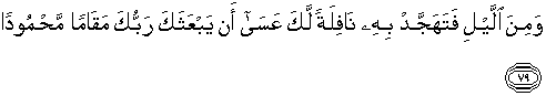 79. Dan pada sebahagian malam hari bersembahyang tahajudlah kamu sebagai suatu ibadah tambahan bagimu; mudah-mudahan Tuhan-mu mengangkat kamu ke tempat yang terpuji.