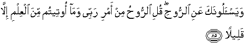85. Dan mereka bertanya kepadamu tentang roh. Katakanlah: "Roh itu termasuk urusan Tuhan-ku, dan tidaklah kamu diberi pengetahuan melainkan sedikit."