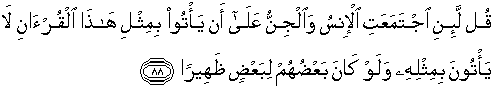 88. Katakanlah: "Sesungguhnya jika manusia dan jin berkumpul untuk membuat yang serupa Al Quran ini, niscaya mereka tidak akan dapat membuat yang serupa dengan dia, sekalipun sebagian mereka menjadi pembantu bagi sebagian yang lain."