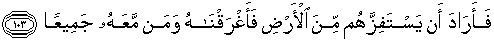 103. Kemudian (Fir'aun) hendak mengusir mereka (Musa dan pengikut-pengikutnya) dari bumi (Mesir) itu, maka Kami tenggelamkan dia (Fir'aun) serta orang-orang yang bersama-sama dia seluruhnya,