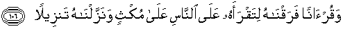 106. Dan Al Quran itu telah Kami turunkan dengan berangsur-angsur agar kamu membacakannya perlahan-lahan kepada manusia dan Kami menurunkannya bagian demi bagian.
