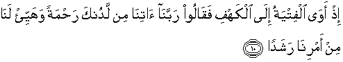 10. (Ingatlah) tatkala para pemuda itu mencari tempat berlindung ke dalam gua, lalu mereka berdoa: "Wahai Tuhan kami, berikanlah rahmat kepada kami dari sisi-Mu dan sempurnakanlah bagi kami petunjuk yang lurus dalam urusan kami (ini)."