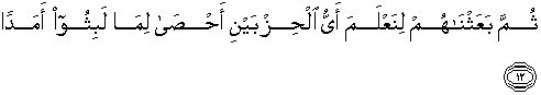 12. Kemudian Kami bangunkan mereka, agar Kami mengetahui manakah di antara kedua golongan itu[874]] yang lebih tepat dalam menghitung berapa lama mereka tinggal (dalam gua itu).