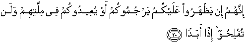 20. Sesungguhnya jika mereka dapat mengetahui tempatmu, niscaya mereka akan melempar kamu dengan batu, atau memaksamu kembali kepada agama mereka, dan jika demikian niscaya kamu tidak akan beruntung selama lamanya."