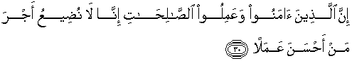 30. Sesunggunya mereka yang beriman dan beramal saleh, tentulah Kami tidak akan menyia-nyiakan pahala orang-orang yang mengerjakan amalan(nya) dengan yang baik.