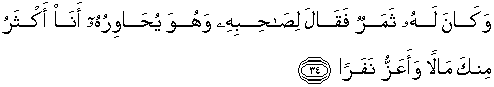 34. dan dia mempunyai kekayaan besar, maka ia berkata kepada kawannya (yang mukmin) ketika bercakap-cakap dengan dia: "Hartaku lebih banyak dari pada hartamu dan pengikut-pengikutku lebih kuat"