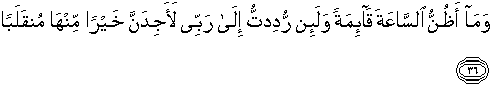 36. dan aku tidak mengira hari kiamat itu akan datang, dan jika sekiranya aku kembalikan kepada Tuhanku, pasti aku akan mendapat tempat kembali yang lebih baik dari pada kebun-kebun itu."