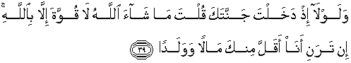 39. Dan mengapa kamu tidak mengatakan waktu kamu memasuki kebunmu "maasyaallaah, laa quwwata