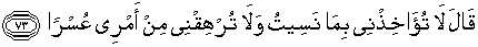 73. Musa berkata: "Janganlah kamu menghukum aku karena kelupaanku dan janganlah kamu membebani aku dengan sesuatu kesulitan dalam urusanku."