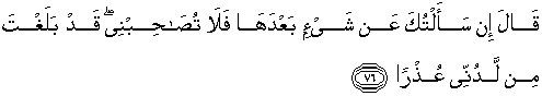 76. Musa berkata: "Jika aku bertanya kepadamu tentang sesuatu sesudah (kali) ini, maka janganlah kamu memperbolehkan aku menyertaimu, sesungguhnya kamu sudah cukup memberikan uzur padaku."