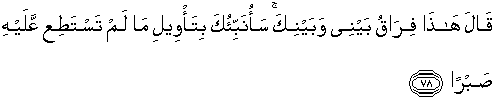 78. Khidhr berkata: "Inilah perpisahan antara aku dengan kamu; kelak akan kuberitahukan kepadamu tujuan perbuatan-perbuatan yang kamu tidak dapat sabar terhadapnya.