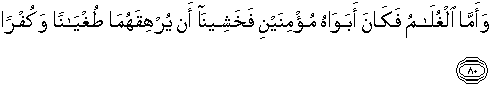 80. Dan adapun anak muda itu, maka keduanya adalah orang-orang mukmin, dan kami khawatir bahwa dia akan mendorong kedua orang tuanya itu kepada kesesatan dan kekafiran.