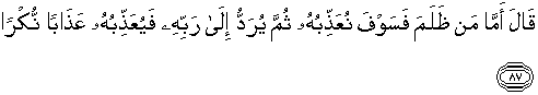 87. Berkata Dzulkarnain: "Adapun orang yang aniaya, maka kami kelak akan mengazabnya, kemudian dia kembalikan kepada Tuhannya, lalu Tuhan mengazabnya dengan azab yang tidak ada taranya.
