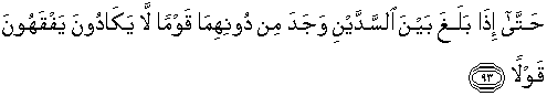 93. Hingga apabila dia telah sampai di antara dua buah gunung, dia mendapati