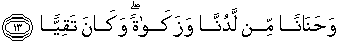 13. dan rasa belas kasihan yang mendalam dari sisi Kami dan kesucian (dan dosa). Dan ia adalah seorang yang bertakwa,