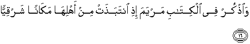 16. Dan ceritakanlah (kisah) Maryam di dalam Al Quran, yaitu ketika ia menjauhkan diri dari keluarganya ke suatu tempat di sebelah timur,