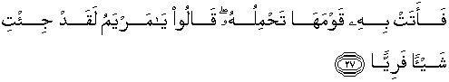 27. Maka Maryam membawa anak itu kepada kaumnya dengan menggendongnya. Kaumnya berkata: "Hai Maryam, sesungguhnya kamu telah melakukan sesuatu yang amat mungkar.