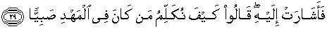 29. maka Maryam menunjuk kepada anaknya. Mereka berkata: "Bagaimana kami akan berbicara dengan anak kecil yang masih di dalam ayunan?"