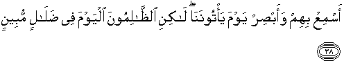 38. Alangkah terangnya pendengaran mereka dan alangkah tajamnya penglihatan mereka pada hari mereka datang kepada Kami. Tetapi orang-orang yang zalim pada hari ini (di dunia) berada dalam kesesatan yang nyata.