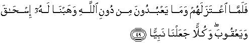 49. Maka ketika Ibrahim sudah menjauhkan diri dari mereka dan dari apa yang mereka sembah selain Allah, Kami anugerahkan kepadanya Ishak, dan Ya'qub. Dan masing-masingnya Kami angkat menjadi nabi.