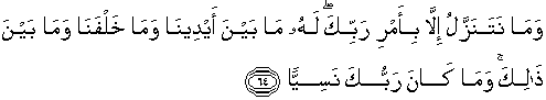64. Dan tidaklah kami (Jibril) turun, kecuali dengan perintah Tuhanmu. Kepunyaan-Nya-lah apa-apa yang ada di hadapan kita, apa-apa yang ada di belakang kita dan apa-apa yang ada di antara keduanya, dan tidaklah Tuhanmu lupa.