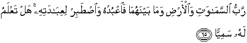65. Tuhan (yang menguasai) langit dan bumi dan apa-apa yang ada di antara keduanya, maka sembahlah Dia dan berteguh hatilah dalam beribadat kepada-Nya. Apakah kamu mengetahui ada seorang yang sama dengan Dia (yang patut disembah)?