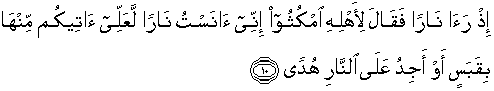10. Ketika ia melihat api, lalu berkatalah ia kepada keluarganya: "Tinggallah kamu (di sini), sesungguhnya aku melihat api, mudah-mudahan aku dapat membawa sedikit daripadanya kepadamu atau aku akan mendapat petunjuk di tempat api itu."
