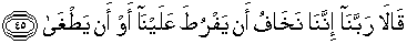 45. Berkatalah mereka berdua: "Ya Tuhan kami, sesungguhnya kami khawatir bahwa ia segera menyiksa kami atau akan bertambah melampaui batas."