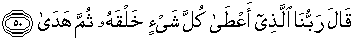 50. Musa berkata: "Tuhan kami ialah (Tuhan) yang telah memberikan kepada tiap-tiap sesuatu bentuk kejadiannya, kemudian memberinya petunjuk