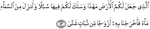 53. Yang telah menjadikan bagimu bumi sebagai hamparan dan Yang telah menjadikan bagimu di bumi itu jalan-ja]an, dan menurunkan dari langit air hujan. Maka Kami tumbuhkan dengan air hujan itu berjenis-jenis dari tumbuh-tumbuhan yang bermacam-macam.