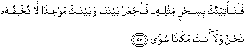 58. Dan kamipun pasti akan mendatangkan (pula) kepadamu sihir semacam itu, maka buatlah suatu waktu untuk pertemuan antara kami dan kamu, yang kami tidak akan menyalahinya dan tidak (pula) kamu di suatu tempat yang pertengahan (letaknya).