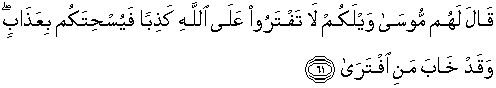 61. Berkata Musa kepada mereka: "Celakalah kamu, janganlah kamu mengada-adakan kedustaan terhadap Allah, maka Dia membinasakan kamu dengan siksa." Dan sesungguhnya telah merugi orang yang mengada-adakan kedustaan.