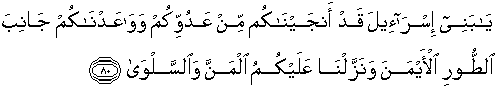 [935]. Yang dimaksud dengan gunung itu disini ialah Gunung Sinai. [936]. Yang bermunajat dengan Allah ialah Nabi Musa a.s. Tetapi disini disebut kamu sekalian karena manfaat munajat itu kembali kepada Nabi Musa a.s. dan Bani Israil kesemuanya. Perjanjian yang dijanjikan itu ialah untuk bermunajat dan menerima Taurat. Arti manna dan salwa lihat not. 53.