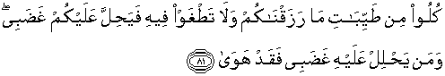 81. Makanlah di antara rezki yang baik yang telah Kami berikan kepadamu, dan janganlah melampaui batas padanya, yang menyebabkan kemurkaan-Ku menimpamu. Dan barangsiapa ditimpa oleh kemurkaan-Ku, maka sesungguhnya binasalah ia.