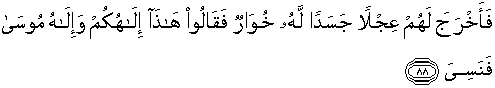 88. kemudian Samiri mengeluarkan untuk mereka (dari lobang itu) anak lembu yang bertubuh dan bersuara