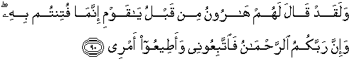 90. Dan sesungguhnya Harun telah berkata kepada mereka sebelumnya: "Hai kaumku, sesungguhnya kamu hanya diberi cobaan dengan anak lembu. itu dan sesungguhnya Tuhanmu ialah (Tuhan) Yang Maha Pemurah, maka ikutilah aku dan taatilah perintahku."