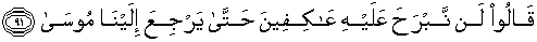91. Mereka menjawab: "Kami akan tetap menyembah patung anak lembu ini, hingga Musa kembali kepada kami."