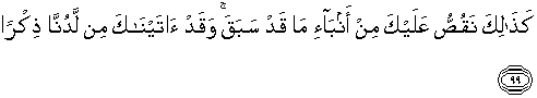 99. Demikianlah kami kisahkan kepadamu (Muhammad) sebagian kisah umat yang telah lalu, dan sesungguhnya telah Kami berikan kepadamu dari sisi Kami suatu peringatan (Al Quran).