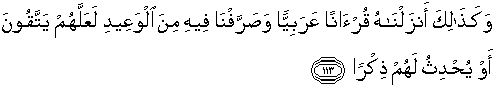 113. Dan demikianlah Kami menurunkan Al Quran dalam bahasa Arab, dan Kami telah menerangkan dengan berulang kali, di dalamnya sebahagian dari ancaman, agar mereka bertakwa atau (agar) Al Quran itu menimbulkan pengajaran bagi mereka.